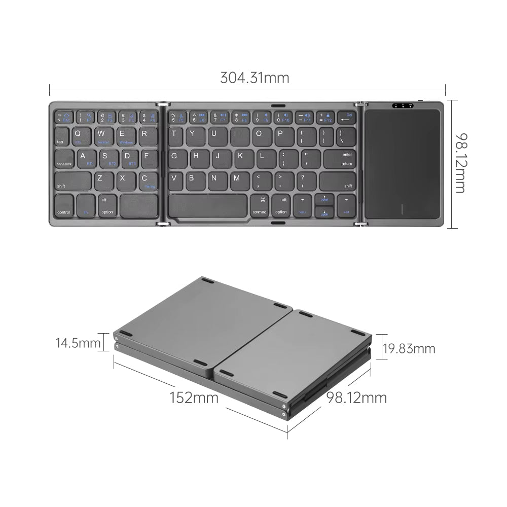 Designed for comfortable typing, the keyboard expands to 304.31mm when open and folds down to 152mm for portability. Despite its compact size, the layout ensures a comfortable and efficient typing experience.