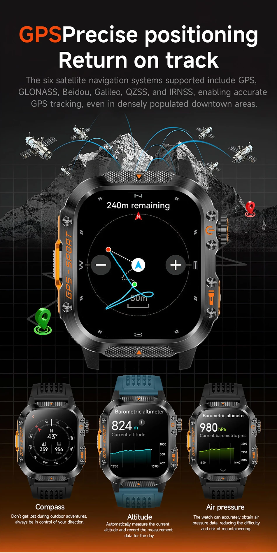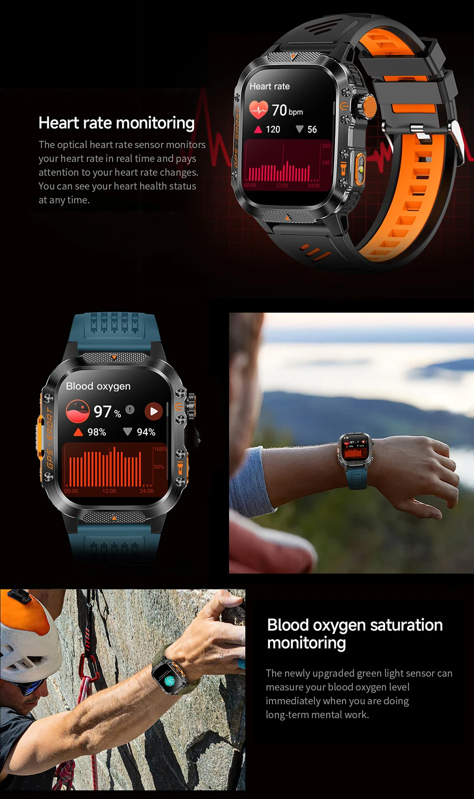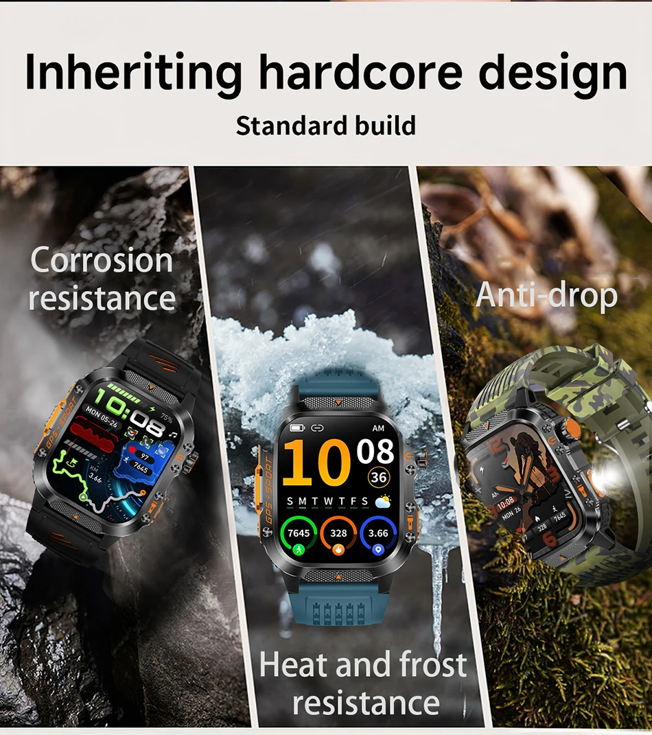 Engineered for extreme conditions, this rugged smartwatch meets strict military durability standards. It resists shocks, impacts, corrosion, and temperature extremes, making it a reliable companion for outdoor adventures, tough work environments, and all‑terrain use.